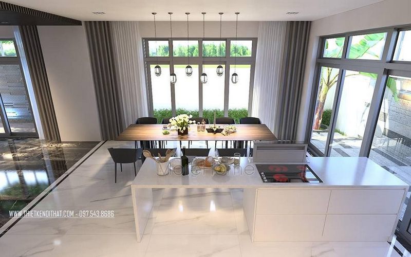 Bàn đảo bếp với kiểu dáng thiết kế hiện đại góp phần giúp không gian thật tinh tế và sang trọng.